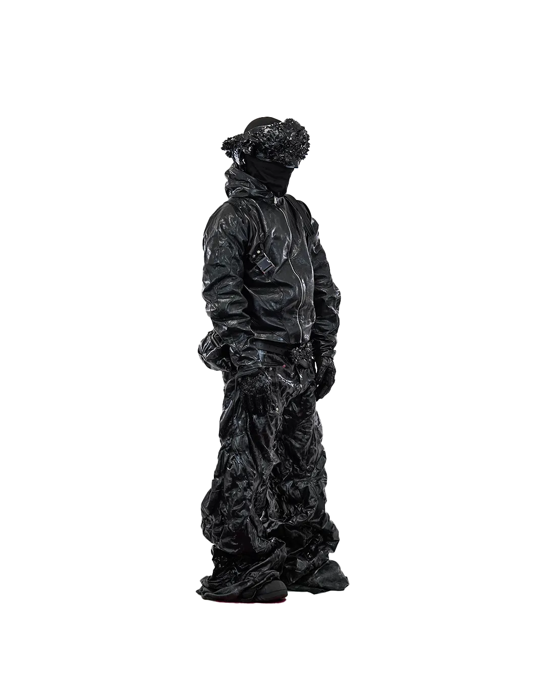 A structured 3D backpack grafted onto the back, functional yet sculptural.